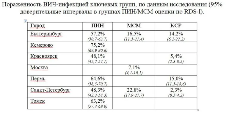 Исследование проходило при поддержке Роспотребнадзора в семи крупнейших городах страны, в том числе в Екатеринбурге . Всего было опрошено 3744 человека. Его результаты удивительны. Так, пораженность ВИЧ-инфекцией среди потребителей инъекционных наркотиков (ПИН) ожидаемо высока — более 50 процентов почти во всех городах: в Екатеринбурге — 57,2%, Перми — 64,6%, Томске — 63,2%.