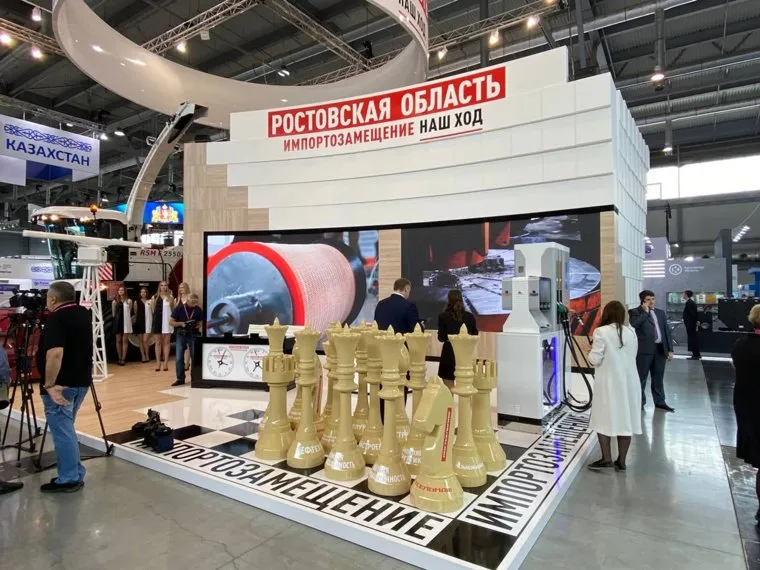 11:16 Участники «Иннопрома» представили гигантские шахматы, посвященные теме импортозамещения. На каждой из фигур написана область российской промышленности.