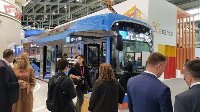 10:25 На выставке показали автобус группы «Синара». Предполагается, что автомобиль заменит часть общественного транспорта в Екатеринбурге.