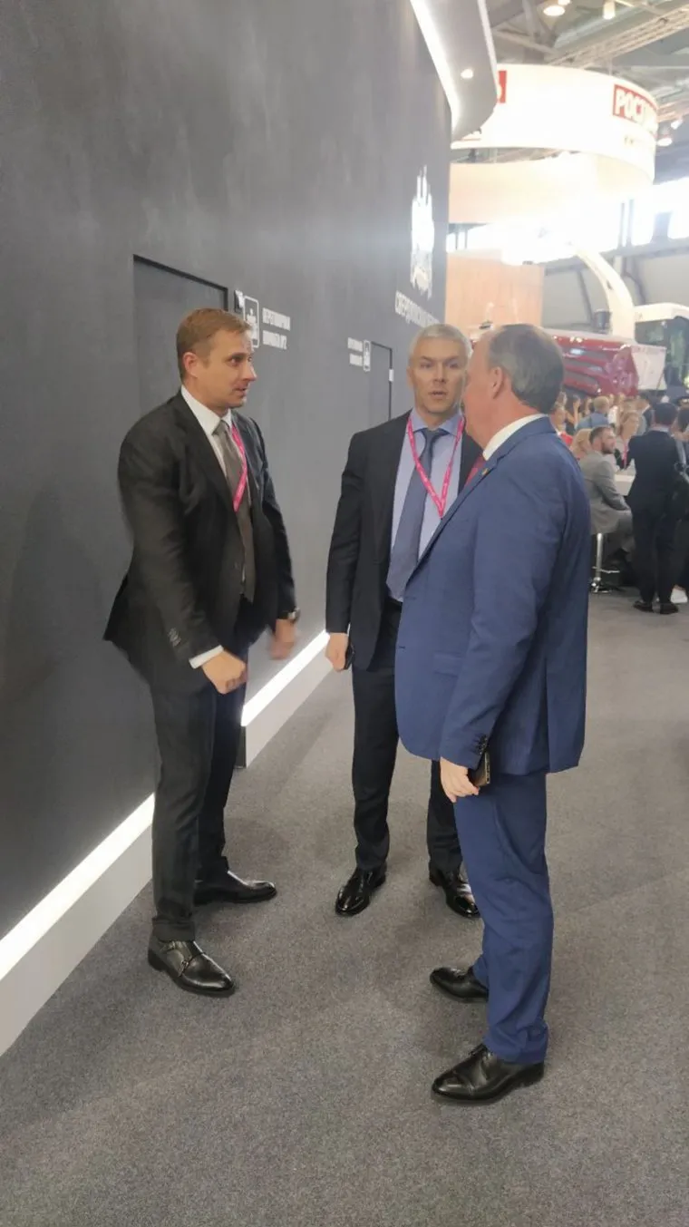 11:42 Мэр Екатеринбурга Алексей Орлов во время «Иннопрома» познакомился с сотрудником кадрового управления администрации президента РФ Иваном Калашниковым. Третий на фото — вице-мэр по стройке Рустам Галямов (по центру).