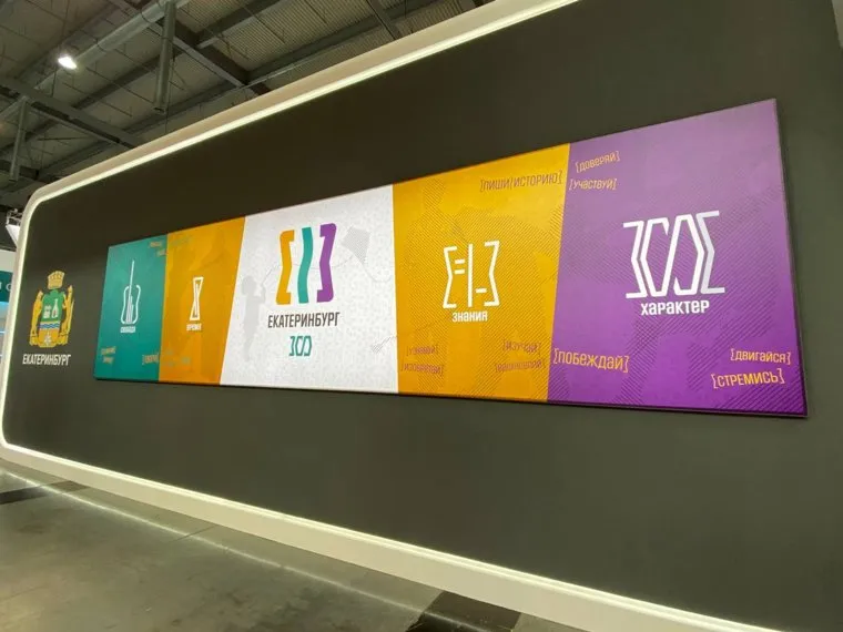 11:51 На выставке расшифровали значение логотипа Екатеринбурга. На экране разместили изображения, символизирующие знание, характер, время и свободу, схожие с логотипом.