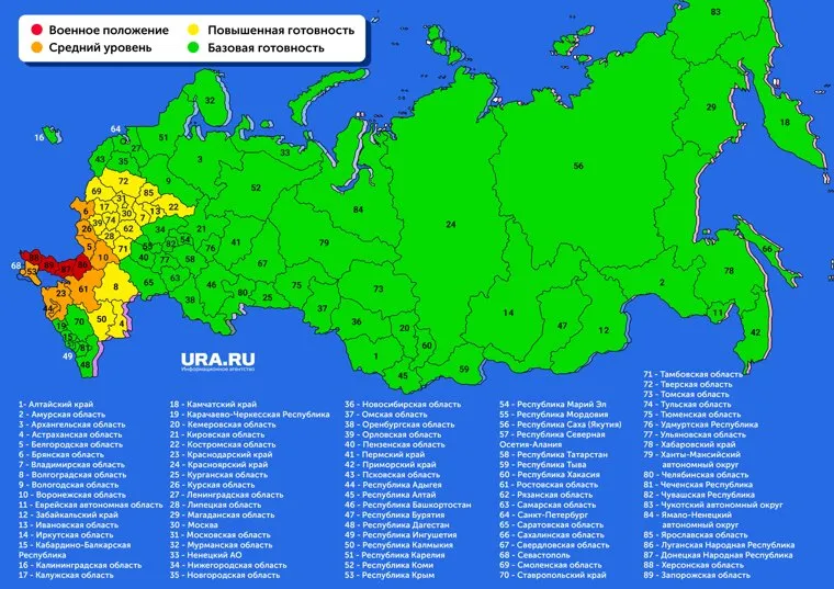 «Ввести на территориях Республики Крым, Краснодарского края, Белгородской, Брянской, Воронежской, Курской, Ростовской областей и Севастополя режим среднего уровня реагирования. Ввести особый режим въезда и выезда, а также ограничение свободы передвижения», — говорится в указе, опубликованном на сайте Кремля.