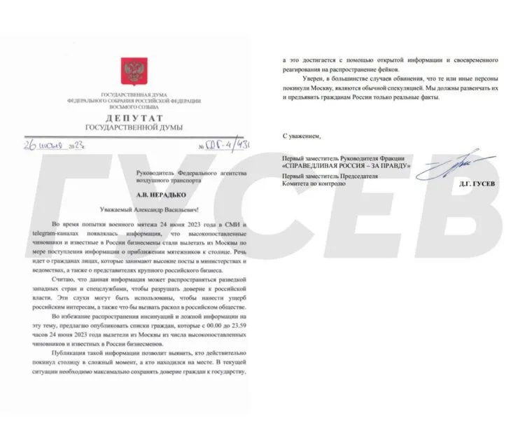 «Предлагаю опубликовать списки граждан, который с 00.00 до 23.59 часов 24 июня 2023 года вылетели из Москвы из числа высокопоставленных чиновников и известных в России бизнесменов», — говорится в документе. Он есть в распоряжении URA.RU.