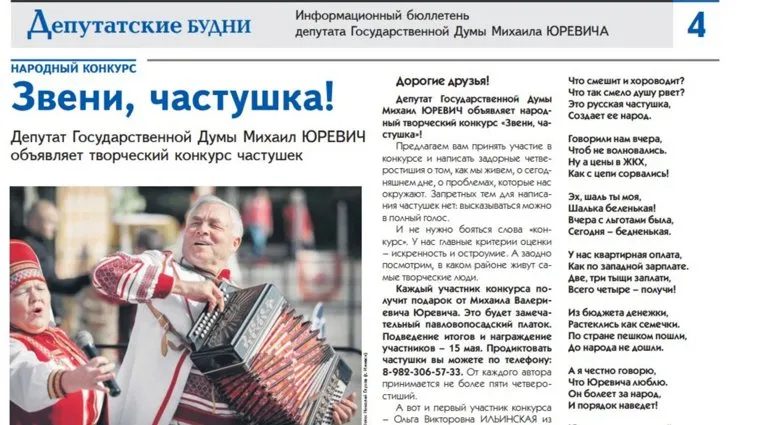 Между тем другие претенденты на мандаты используют более яркие идеи. Так, в штабе экс-губернатора, депутата Госдумы Михаил Юревич (он готовится к праймериз по Челябинскому округу) объявили конкурс частушек. Своими творениями авторы делятся по телефону, и в день поступает по два десятка куплетов. Скоро их будут публиковать в газете, а далее — в интернете. Обещают и телевариант. Вот лишь несколько примеров народного творчества.