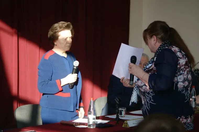 «Готовы ли вы предоставить выступающему еще 30 минут?» — спросила Комарова у населения. Жители ответили: «Нет».