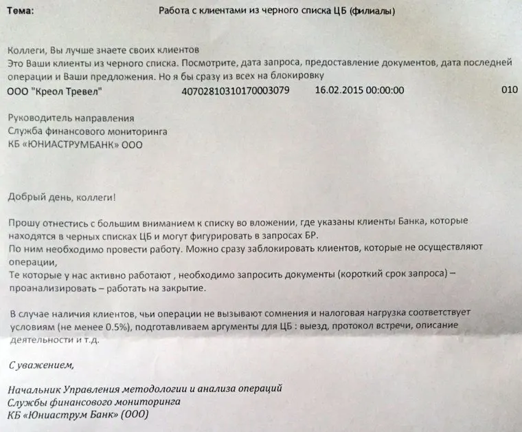 Игорь Вожагов поделился с «URA.Ru» любопытной бумагой «из внутренней банковской переписки», где финучреждениям даются рекомендации «работать на закрытие [счетов турфирм]». За подлинность бумаги, впрочем, наше агентство не ручается