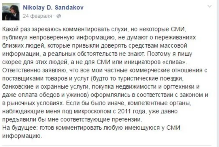 Информация о том, что силовиков заинтересовала история с охраной коттеджа, появилась в двадцатых числах февраля. Калугин стал активно сотрудничать со следствием. Примечательно, что сам Сандаков тут же прокомментировал это в своем Facebook (деятельность запрещена в РФ), пожурив журналистов: «Ответственно заявляю, что все мои частные коммерческие отношения с поставщиками товаров и услуг (будто то туристические поездки, банковские и охранные услуги, покупка недвижимости и оргтехники и даже оплата обедов и ужинов) оформлялись в соответствии с законом и в рыночных условиях. Если бы было иначе, компетентные органы, наблюдающие меня под микроскопом с 2011 года, уже давно предъявили бы мне соответствующие претензии».