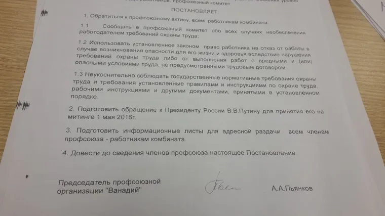 Постановление профсоюзного комитета комбината от 21 апреля 2016 года фактически запускает «итальянскую забастовку»