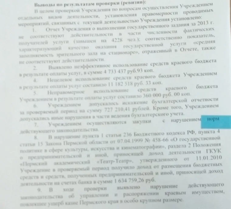 Он же сравнивает, что при несоизмеримых показателях финансирования Театр-Театр заработал на спектаклях меньше Пермского ТЮЗа, Театра «У моста» и других театров Урала, Поволжья и Сибири.