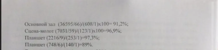 Первое, что изучили ревизоры, — это заполняемость зрительных залов. От этого показателя зависит уровень финансирования, достаток самих актеров и, разумеется, статус театра. Согласно отчету, по итогам ревизии (скан фрагмента) его залы не пустуют. Более того,