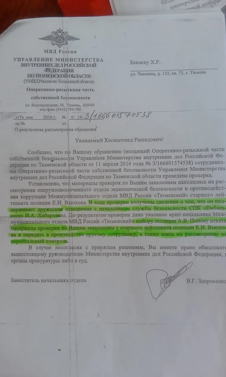 Его подозрения подтвердились: оказалось, что Вьюхов «поддерживает дружеские отношения с начальником службы безопасности СПК «Ембаевское И.А. Хабаровым» (документ имеется в распоряжении редакции). По результатам проверки полицейского от дела отстранили, а материалы передали другому сотруднику.