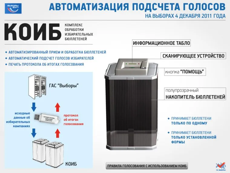 Комплекс обработки информационных бюллетеней (КОИБ) — это, по сути, два ящика для бюллетеней. Они соединены друг с другом, с системой ГАС «Выборы» и с принтером, на котором распечатываются итоговые результаты. Чтобы попасть внутрь полупрозрачного ящика, бюллетень должен пройти через сканер, который распознает отметки избирателей. Идентификация бюллетеней (с этого участка или нет) производится по оттиску печати участковой избирательной комиссии, также распознаваемой сканером. Подсчет числа проголосовавших идет одновременно с самим голосованием.