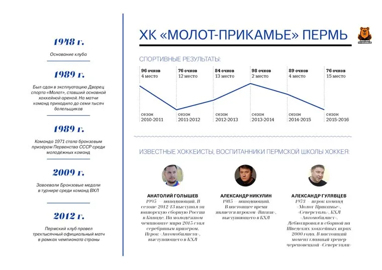 Успех пермяков объясним: своей команды в КХЛ у них нет. Самый топовый хоккейный клуб — «Молот-Прикамье». Несмотря на поражения — еще в сезоне 2014-2015 пермяки были на четвертом месте в таблице регулярного чемпионата, а в прошлом году спустились на 15-ю строчку, — команду в городе боготворят. Среди пяти уральских клубов здесь самая большая арена и высокое количество зрителей — 5000 человек. Для сравнения — в Екатеринбурге «Автомобилист» не на каждый матч способен собрать столько зрителей.