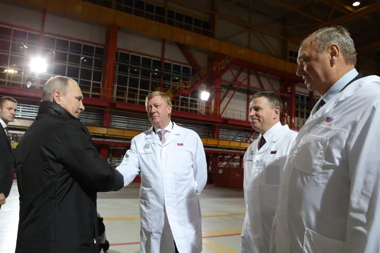 На ЧТПЗ Путина со второй половины дня ожидали гендиректор ООО «ЭТЕРНО» Валентин Тазетдинов, член совета директоров ЧТПЗ Андрей Комаров и глава «Роснано» Анатолий Чубайс. Ожидали к 18:30, но вертолеты начали приземляться на территории предприятия лишь около восьми вечера. Вдвоем нажав кнопку на интерактивном дисплее, Путин и Чубайс запустили новое производство. А потом президент беседовал с трудовым коллективом. Здесь же, на встрече, ему подарили книгу о легендарном директоре ЧТПЗ Якове Осадчем.