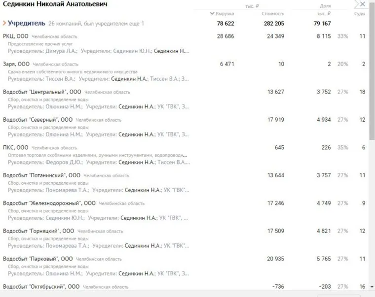 Николаю Сединкину принадлежит более десятка ООО, часть из них была еще при мэре Михаиле Конареве просто посредниками — там получали воду за копейки, а до потребителя она доходила уже по десятикратной цене. Так, к примеру, происходило с ООО «Водосбыт „Южный“», где «маржа» достигала 1000 процентов.