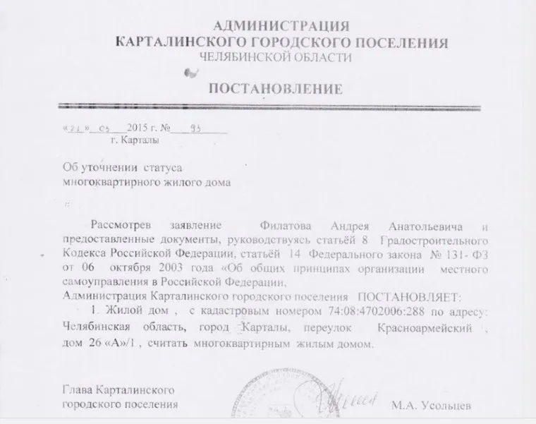 Заинтересовал ревизоров и акт от 23 мая 2015 года, подписанный главой Карталинского городского поселения Михаилом Усольцевым, согласно которому следует считать один из домов «многоквартирником», хотя ни по каким нормативам он таковым считаться не может. Многоквартирные дома может возводить только строительная фирма, с соответствующей лицензией. А Анатолий Филатов не имеет даже статуса ИП, власти выкупили у него квартиры как у физического лица.