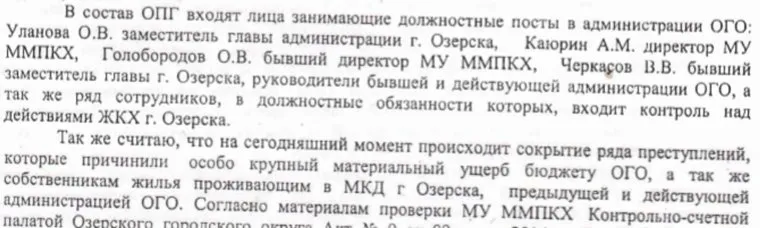 Депутат Александр Откупщиков еще месяц назад писал начальнику управления ФСБ по Челябинской области Юрию Никитину об «устоявшемся преступном сообществе», основанном на «клановых отношениях» и «лоббируемом правоохранительными структурами». «В преступную группу входят высокопоставленные чиновники ОГО [Озерского городского округа], как действующей, так и предыдущей администрации. На территории ОГО уничтожается любое проявление свободного от ОПГ бизнеса. Фактически существование ОПГ подтверждает опубликованное в СМИ постановление о проведении оперативно-розыскных мероприятий», — говорится в обращении.