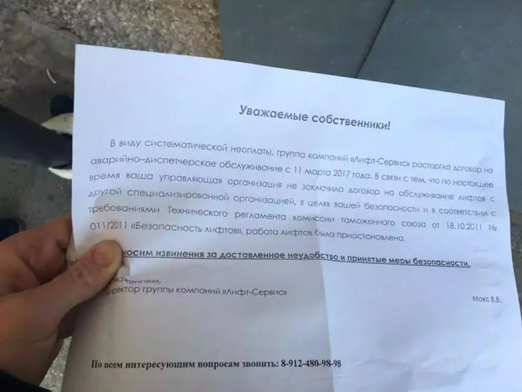 «Единственным обстоятельством, при котором допустимо приостановление оказания услуг лифта — это решение Ростехнадзора или других специализированных организаций о невозможности дальнейшей эксплуатации ввиду неисправностей либо возникновения угрозы для жизни и здоровья человека», — отметил парламентарий.