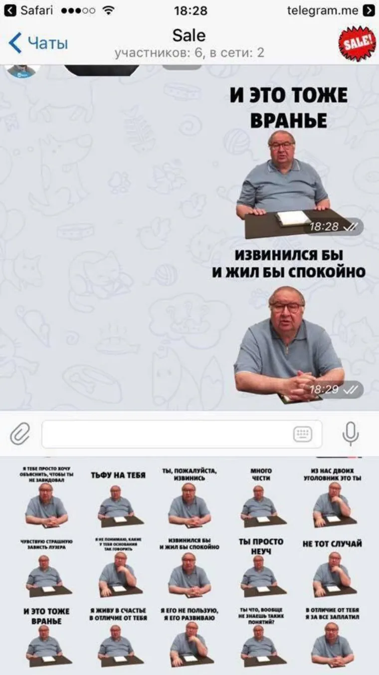 Обращение миллиардера к оппозиционеру стало таким популярным среди пользователей Сети, что к вечеру четверга в Telegram появился набор стикеров с фразами Усманова. Бизнесмен в серой футболке сидит за столом, в сопровождении его хлестких фраз: «извинился бы и жил бы спокойно», «тьфу на тебя», «ты просто неуч», «в отличие от тебя я за все заплатил» и «я тебе просто хочу объяснить, чтобы ты не завидовал».