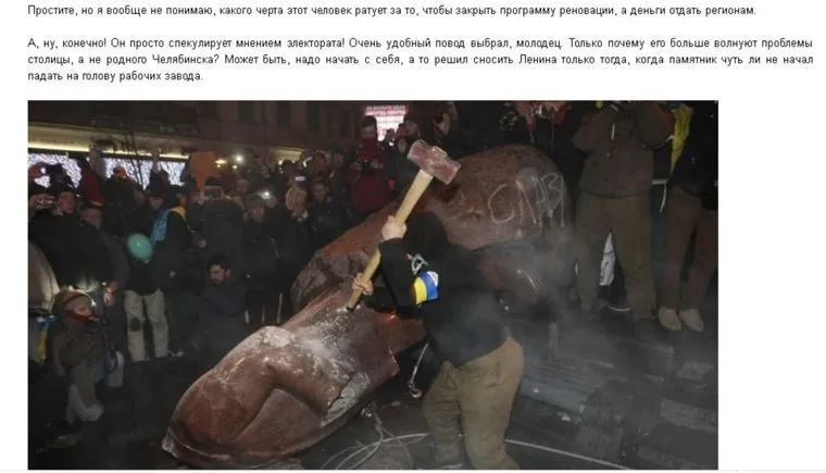 Депутату Госдумы от левой партии припомнили доходы его супруги, семейный бизнес. Отдельно описали историю со сносом во время субботника старого памятника Ленину на территории Челябинского кузнечно-прессового завода. Ветераны и КПРФ обиделись за столь варварское отношение к монументу вождя революции с учетом того, что снос произошел в день Первомая.