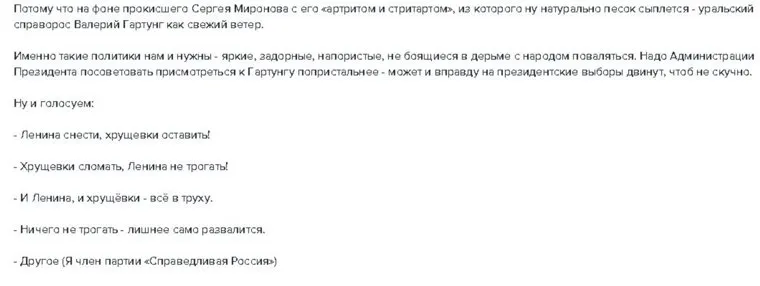 «Вероятно, идея о том, что Гартунг может стать кандидатом от «СР», якобы отодвинув Миронова, была вброшена специально. Проверить, насколько сильна дисциплина в партии. Не подастся ли он соблазну выдвинуть себя на передовые позиции? Выступление против личного проекта Сергея Собянина дает основания считать, что Гартунг соблазну поддался, — считает политолог Андрей Мельников . — Но мэрия зорко следит за тем, чтобы никто со стороны не пытался набрать «политический капитал» на столь важном вопросе. Отсюда и организованный сторонниками мэрии «троллинг».