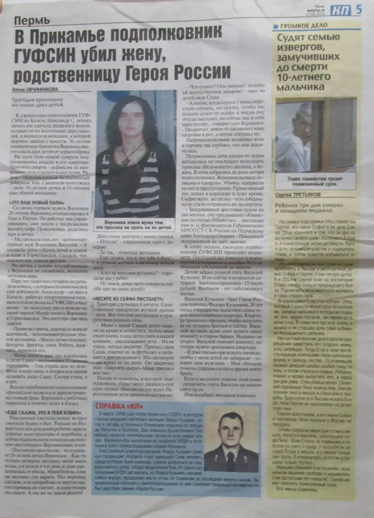 Ранее было известно, что в ночь с 8 на 9 августа в Кизеле между подполковником и его женой в их квартире произошел конфликт. Там же находились дети женщины от первого брака — 11-летний сын и 10-летняя дочка. Во время ссоры женщина почувствовала себя плохо. Муж стал ее избивать, заставил детей принести пистолет из сейфа. Подполковник сначала застрелил пса-добермана Зевса, который начал вести себя агрессивно, а затем зачем-то стал засовывать жене в рот пальцы и патроны. Детей выгнал из дома — сказал, что убьет себя. В итоге женщина умерла от удушья. Дети же добрались до матери отчима, которая и вызвала полицию. Убийца не пытался бежать — его задержали в квартире.