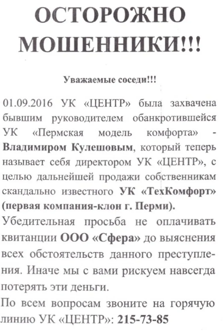 Информация о «рейдерском захвате» УК «Центр» (обслуживает более сотни домов в Перми) сначала появилась в социальных сетях. Основная версия: конфликт возник вокруг схемы приема платежей от жителей. С 1 июня руководство компании приняло решение изменить расчетный счет в квитанциях. Ранее средства поступали через расчетный центр «Сфера» (обслуживает в Перми ряд УК). Теперь же «Центр» решил брать деньги жителей напрямую.