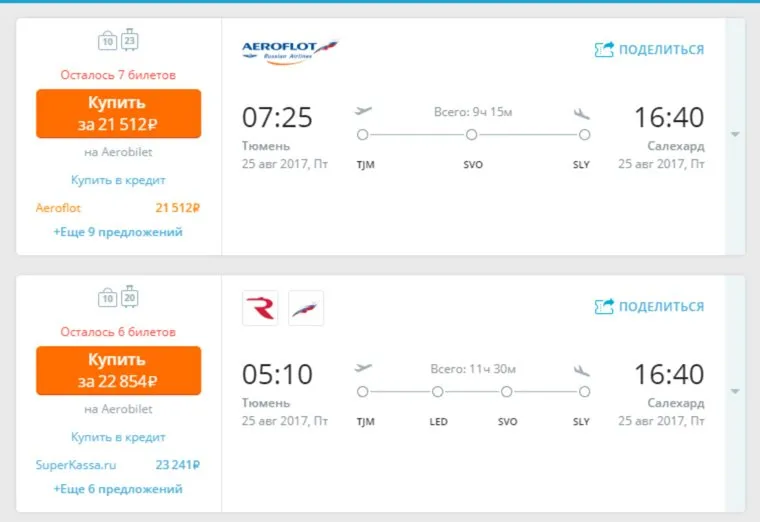 Альтернативные предложения для полета из Тюмени в Салехард на 25 августа. Они дешевле прямого рейса