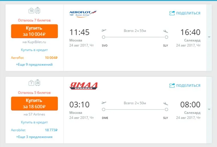 Стоимость билетов на рейс Москва — Салехард авиакомпаний «Аэрофлот» и «Ямал»