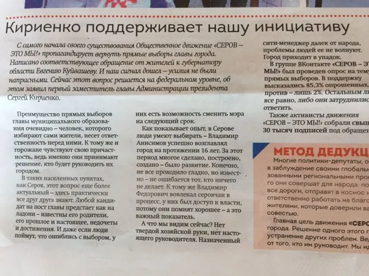 17 августа был нарушен спокойный ход выборов депутатов Серовской городской думы. В день, когда большинство местных ВИПов уехали на проходивший в соседнем Краснотурьинске Гражданский форум, злоумышленники напали на склад штаба «Единой России» в ДК Металлургов. Они были настолько уверены в безнаказанности, что взломали помещение, не пряча своих лиц. Незваные гости погрузили листовки кандидатов от правящей партии вместе с газетами врио губернатора Евгения Куйвашева в микроавтобус и дали газу.