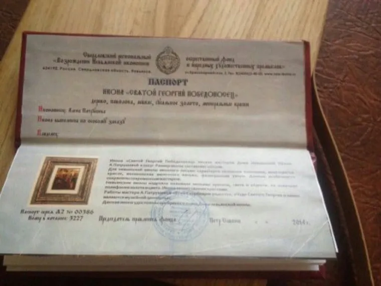 Паспорт на икону «Георгия Победоносца». В документе значится, что икона изготовлена на дереве. Но мы помним ту отклеившуюся кайму, которой фанеру маскировали под древесину