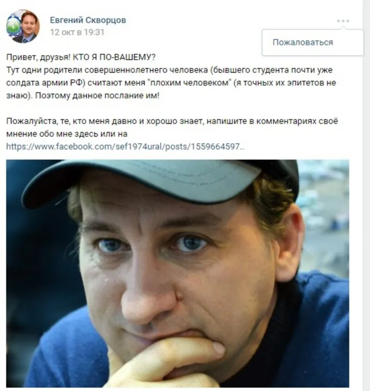 Возможно, именно этому инциденту посвящена запись на странице Евгения Скворцова от 12 октября: «Привет, друзья! КТО Я, ПО-ВАШЕМУ? Тут одни родители совершеннолетнего человека (бывшего студента, почти уже солдата армии РФ) считают меня „плохим человеком“ (я точных их эпитетов не знаю). Поэтому данное послание им! Пожалуйста, те, кто меня давно и хорошо знает, напишите в комментариях своё мнение обо мне…» В комментариях к посту содержатся лишь положительно-позитивные отклики.