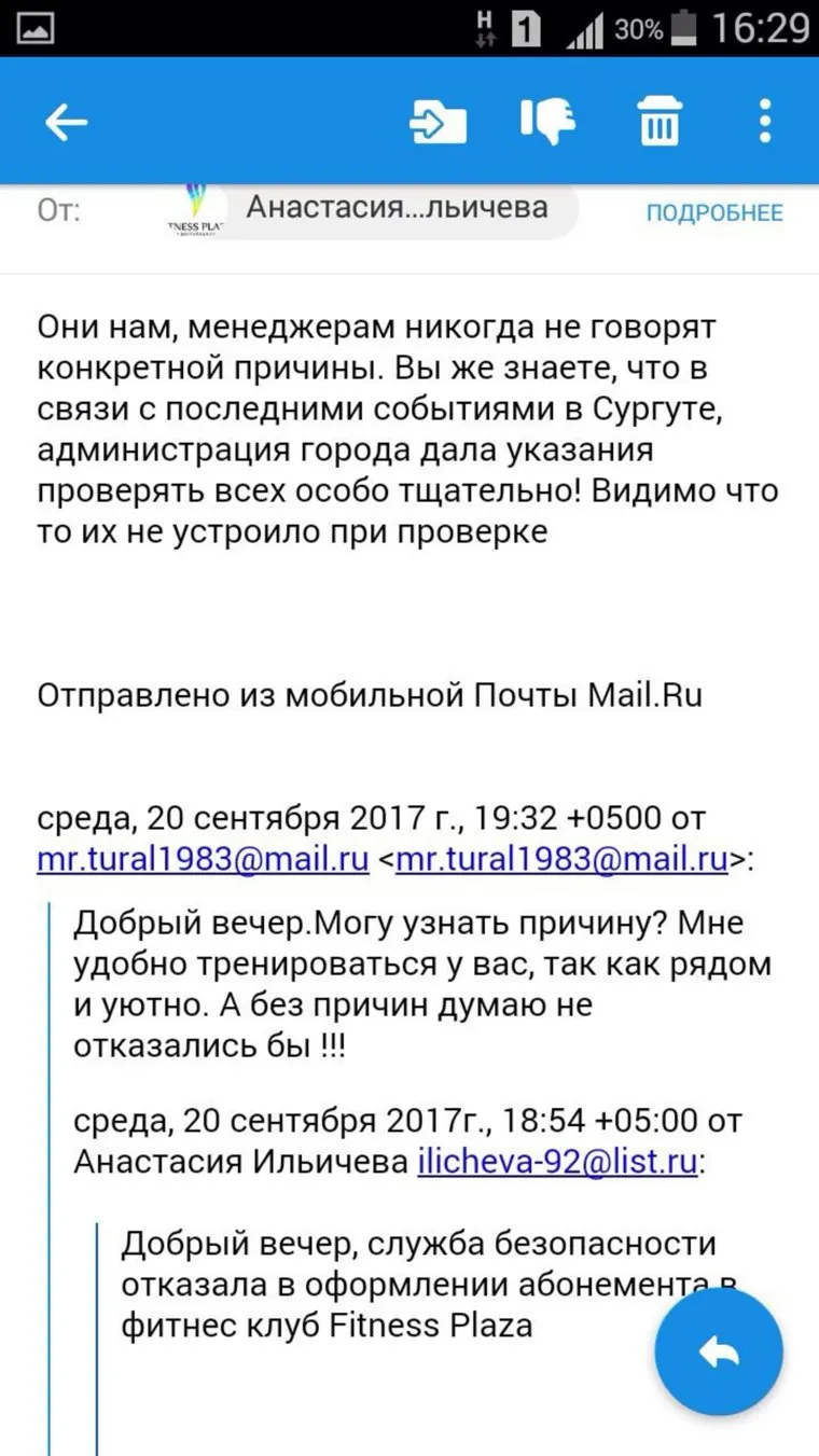 В азербайджанской диаспоре Сургута честно признаются: такие мелкие случаи происходят слишком часто, но из-за резонанса старейшины уже начали разбираться в ситуации , и выяснилась удивительная деталь — в фитнес-центрах отказывают кавказцам, ссылаясь на некое указание местной администрации. В распоряжении «URA.RU» есть даже скриншот переписки, где администратор одного из тренажерных залов перекладывает ответственность на чиновников. «В связи с последними событиями в Сургуте администрация города дала указание проверять всех особо тщательно! Видимо, что-то их не устроило при проверке», — говорится в письме.