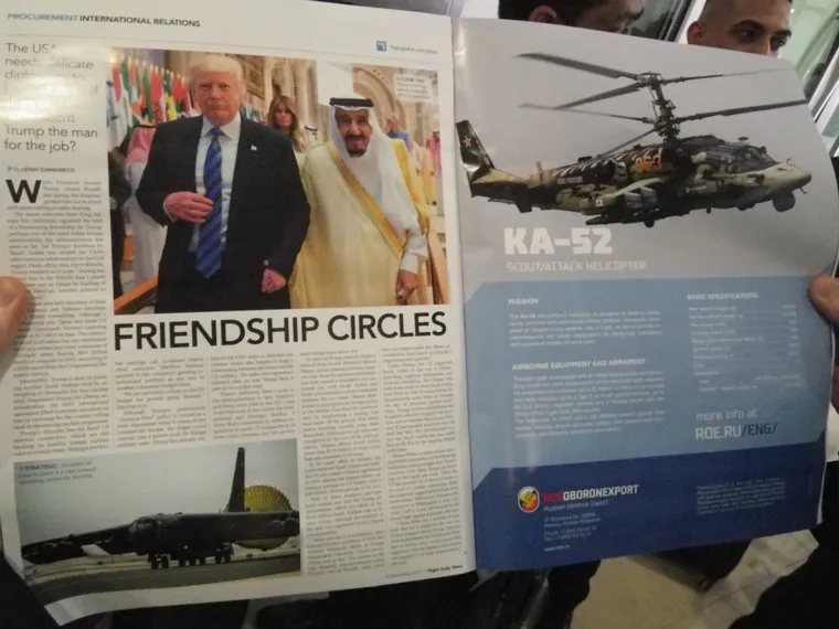 Для России авиасалон — традиционно способ показать свою мощь в регионе, где у нас почти не осталось влияния. Родина старается как может: в местном раздаточном материале — новостном издании про AirShow — рядом с критикующей президента США Дональда Трампа статьей расположена реклама Рособоронэкспорта. Совпадение? Возможно.