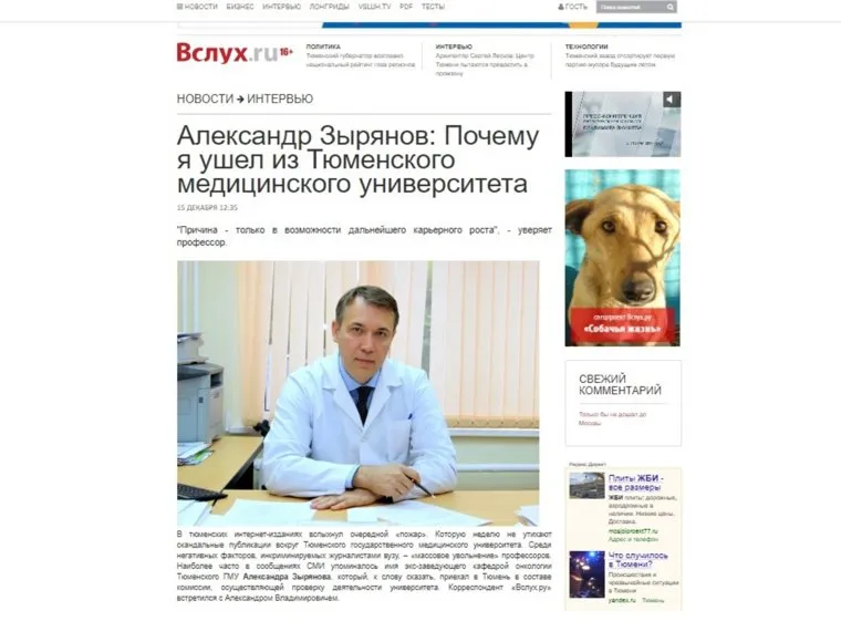 В последний день спецмероприятий, 15 декабря, интернет-издание «Вслух.ру» опубликовало интервью одного из членов федеральной комиссии, бывшего заведующего кафедрой онкологии Тюменского ГМУ Александра Зырянова. В материале он объясняет причины своего ухода из медицинского вуза: «Мне предложили перейти на другую работу в Уральский государственный медицинский университет на должность проректора. (…) Причина — только в возможности дальнейшего карьерного роста».