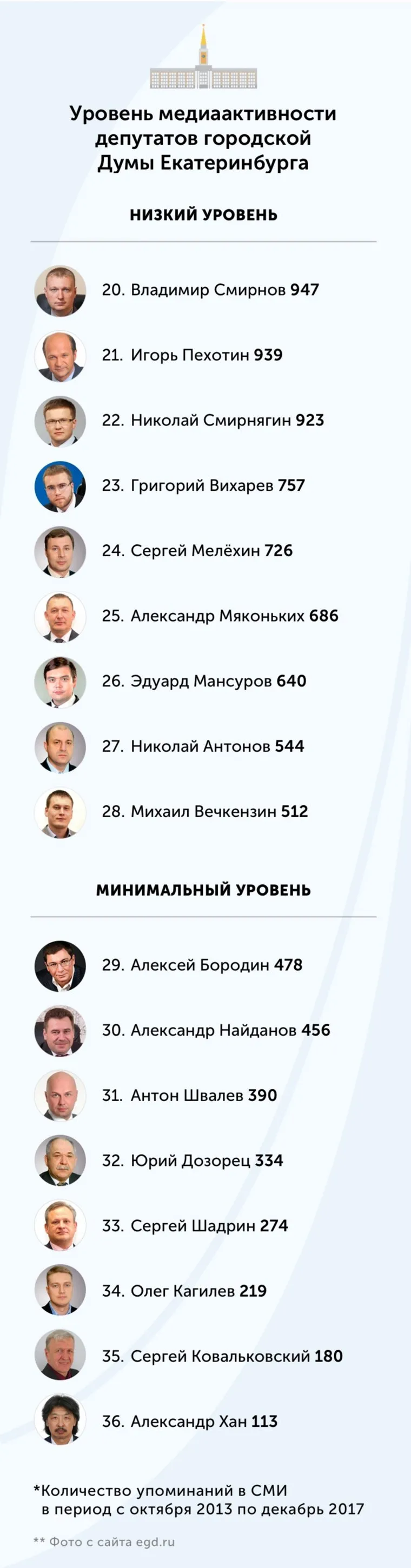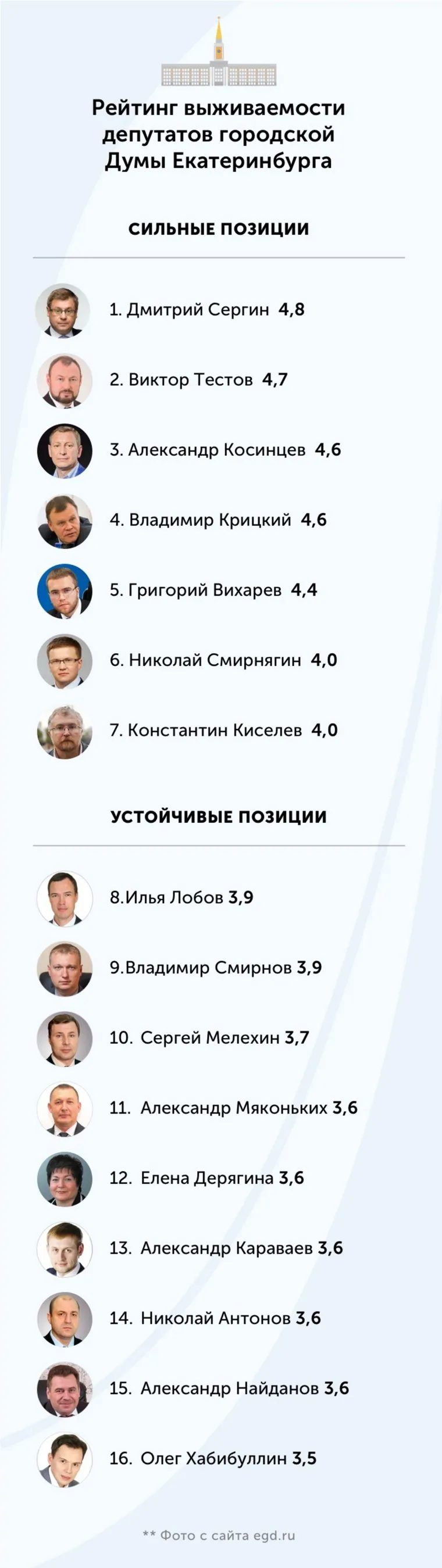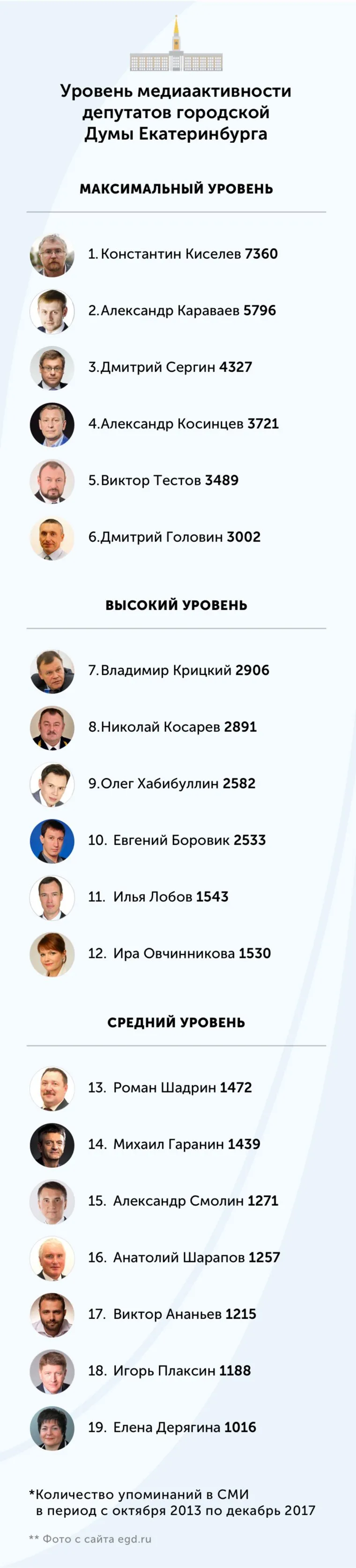 Возглавил рейтинг один из наиболее приближенных к руководителям мэрии Екатеринбурга депутатов Дмитрий Сергин . Помимо серьезного административного ресурса, он обладает политическим — парламентарий возглавляет региональное отделение «Российской партии пенсионеров», от которого выдвигался кандидатом в губернаторы Свердловской области. Эти факторы позволили Сергину стать значимой медиаперсоной (он занял третье место в рейтинге медиаактивности). «Верный солдат [первого заместителя губернатора Свердловской области] Владимира Тунгусова. Всегда на передовой…. Обладает хорошим потенциалом и договороспособностью… Таких не бросают. Отличная работа с электоратом», — отмечают в своих комментариях эксперты.