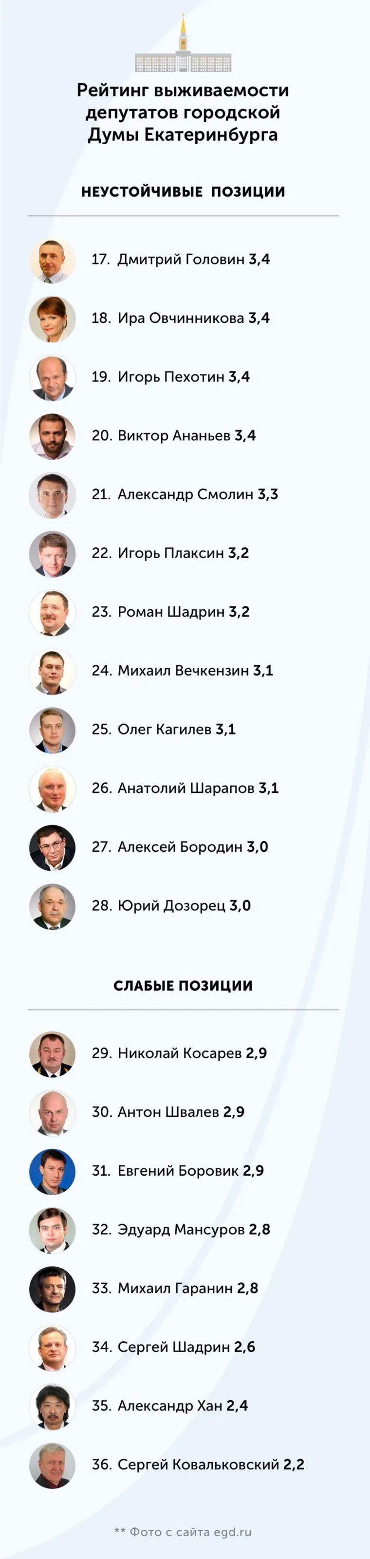 Наиболее слабыми оказались позиции у восьми депутатов. Сопредседателя свердловского ОНФ Николая Косарева подвело возбуждение уголовных дел в УрГГУ, в котором он до лета 2017 года занимал пост ректора: «Теперь вопрос о переизбрании Косарева будет решаться на федеральном уровне. Наиболее ярким комментарием о деятельности Евгения Боровика стало предложение одного из участников исследования номинировать его на звание «зряшный мандат».