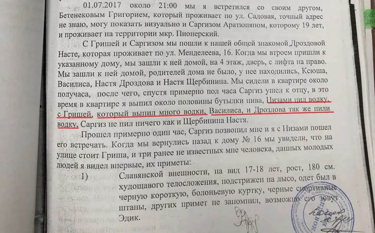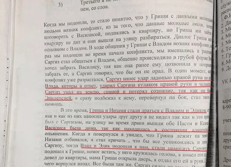 По его словам, когда они подъехали к дому на улице Менделеева (где проходила вечеринка), их встретили сестра Василисы и 16-летний парень Гриша. «Эдик подходит, здоровается, а этот Гриша ему с ходу: „Завали… [рот, нецензурное]“. Я шел чуть сзади. Подхожу, спрашиваю: „В чем дело?“ Гриша и меня посылает матом, — говорит Влад. — Я несколько раз попросил его извиниться, но он не извинился».