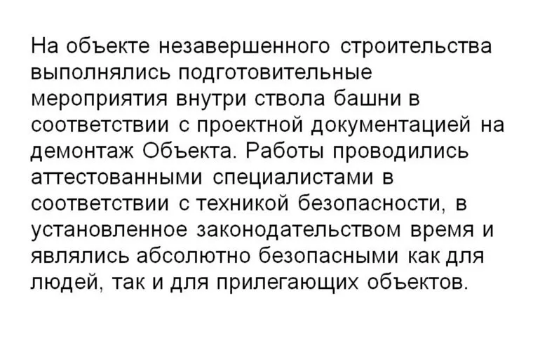 А вот когда будет демонтаж самой башни, тогда уже мы будем уведомлять МЧС, администрацию города, МВД. Минимум за сутки будет оповещение о дате и времени, и с точностью до секунды будут произведены все работы.