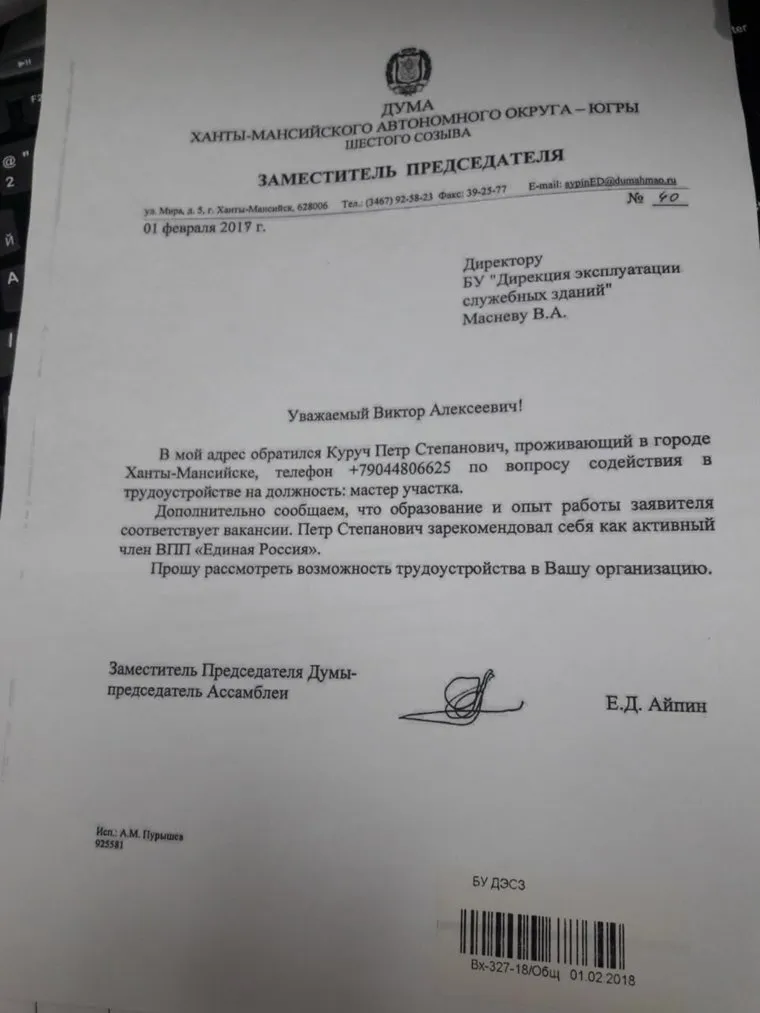 По словам собеседника, вице-спикер рассылает в правительственные учреждения рекомендательные письма (копия письма есть в распоряжении агентства), где просит отдать должность определенному кандидату, а руководители организаций не могут отказать политику — даже в случае, когда ставленники Айпина не подходят для должности. «Еремей Данилович обладает большим уважением и влиянием в ХМАО. Его рекомендательные письма, скорее, носят настоятельный характер и не оставляют выбора», — комментирует источник агентства.