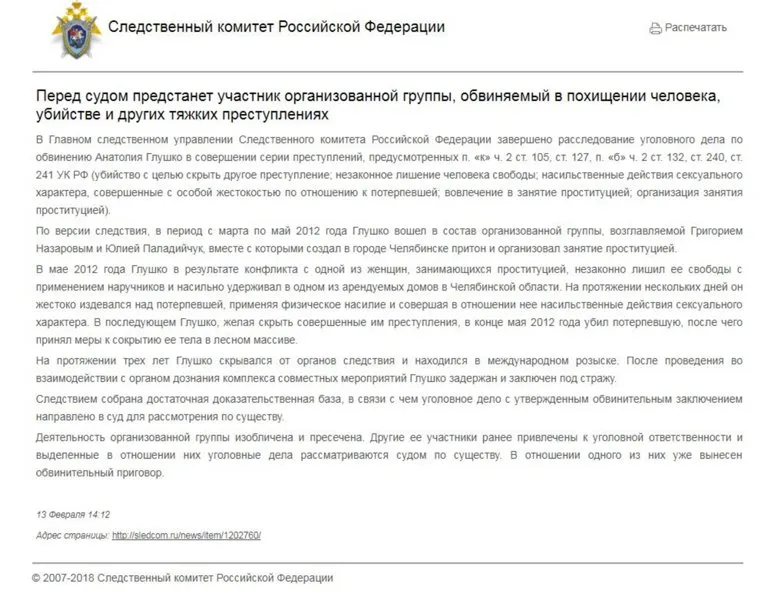 Новость на сайте Следственного комитета России о начале суда над убийцей-сутенером Глушко