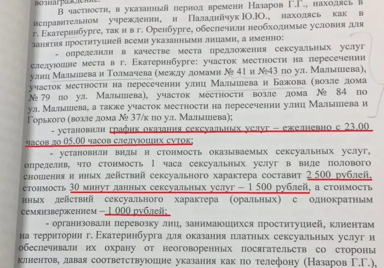 Расценки ОПГ Назарова-Паладийчук на секс-услуги на улице Екатеринбурга