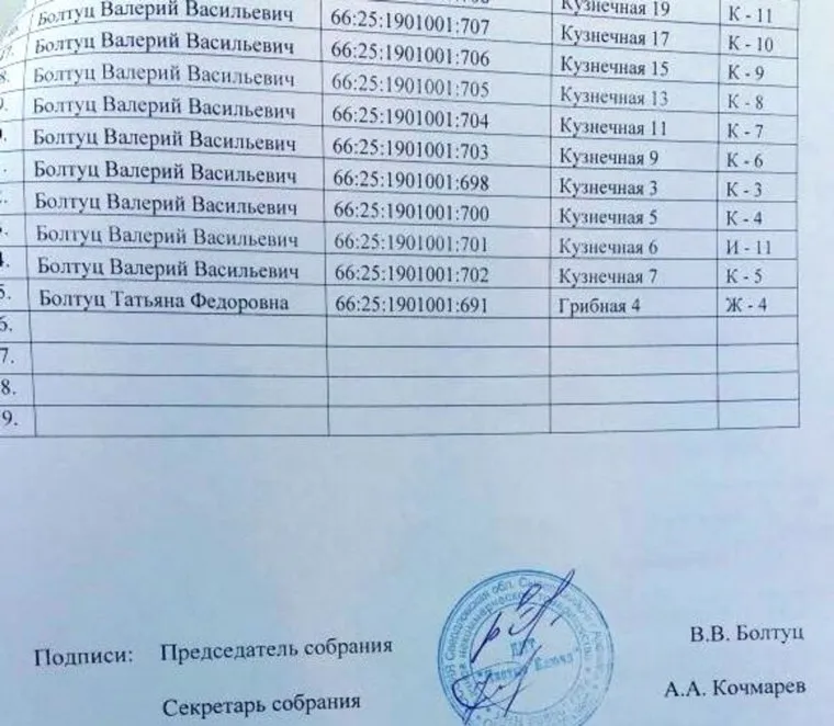 Последняя новость, касающаяся ДНТ для ветеранов и сотрудников полиции, и вовсе его обескуражила: в администрацию Сысерти недавно был подан протокол собрания членов правления от 10 декабря 2017 года, согласно которому 24 участка распределяются на Алимова и 31 — на Болтуца. Под документом стоит подпись секретаря собрания Кочмарева.