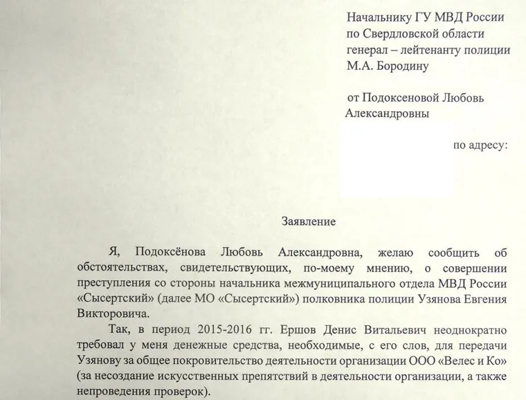 Фрагмент заявления Любы на начальника полиции Сысерти