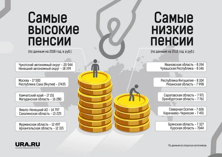 Традиционно больше всего получают жители районов Крайнего Севера и российской столицы. « Дело в том, что продовольственная корзина во многом зависит от климатических условий, и именно поэтому на Дальнем Востоке пенсии, как правило, выше, чем в других регионах страны. Например, в Чукотском автономном округе пенсионеры получают 20000 рублей без надбавок, тогда как в Москве минимальная пенсия с 1 января этого года даже со всеми столичными надбавками составляет 17500 рублей», — сообщил «URA.RU» глава Центра урегулирования социальных конфликтов Олег Иванов . Он констатировал, что государство уже не первый год проводит политику минимизации своих пенсионных обязательств.