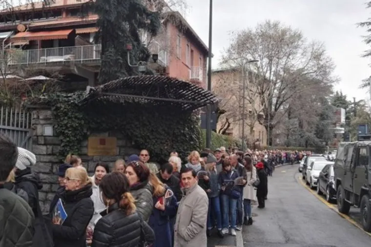 Очередь у входа в избирательный участок в генконсульстве России в Милане