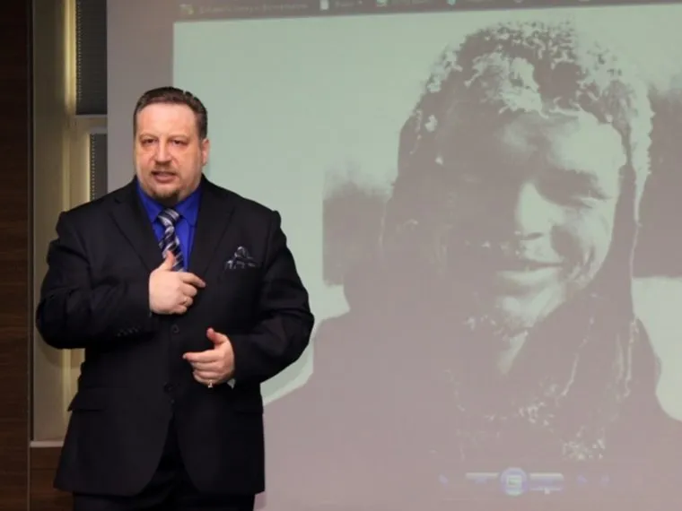 Писатель-историк Олег Архипов на фоне фотографии Игоря Дятлова