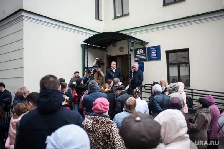 Критики организации праймериз «ЕР» у входа в здание свердловский исполком партии (15 мая)