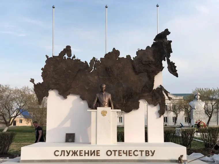 — Самое простое было бы оставить центральную фигуру. Но это долгоиграющая композиция, она говорит о том, что мы имеем сегодня крепкое государство, давайте на этой земле творить, созидать… Фигура президента простояла на площади неделю. Мы примерили флаги, установили надпись «Служение Отечеству». Центральную фигуру мы прибрали в надежное место до поры. Сейчас было бы ставить ее оскорбительно.