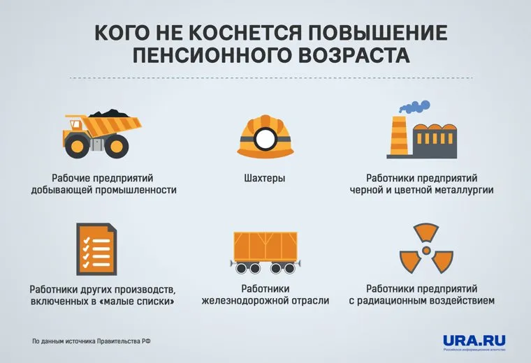 Российское правительство решило оставить действующие правила выхода на пенсию для граждан, занятых на работах с вредными, тяжелыми условиями труда (рабочие шахт, добывающей промышленности, черной и цветной металлургии, железнодорожной отрасли и ряда других, включенных в так называемые «малые списки»), а также испытывающих воздействие радиации.